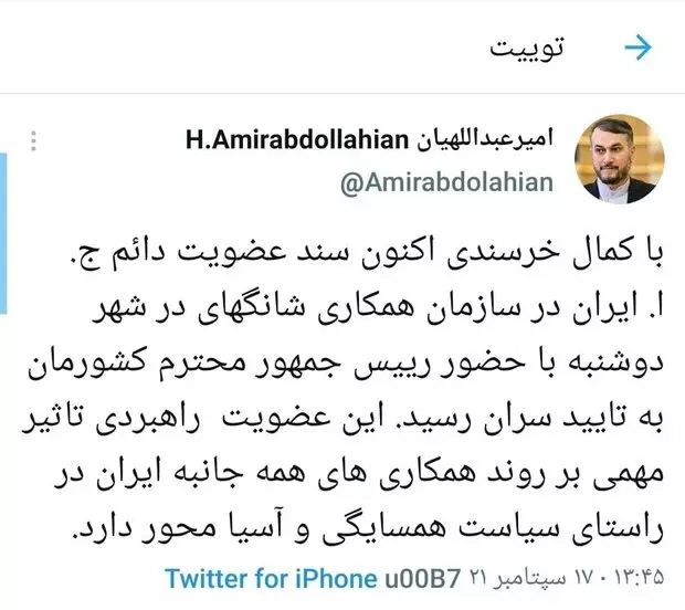 پس از پایان این اجلاس، امیرعبداللهیان در صفحه شخصی خود در توئیتر از تأیید سند عضویت کشورمان خبر داد و نوشت: با کمال خرسندی اکنون سند عضویت دائم جمهوری اسلامی ایران در سازمان همکاری شانگهای در شهر دوشنبه با حضور رئیسجمهور کشورمان به تأیید سران رسید. این عضویت راهبردی تأثیر مهمی بر روند همکاریهای همه جانبه ایران در راستای سیاست همسایگی و آسیا محور دارد.