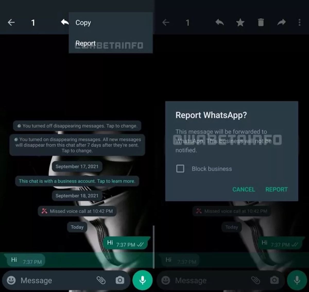 سیستم گزارش فعلی، پیام جدید و چهار پیام آخر را برای واتساپ ارسال میکند و پیامهای اضافی به شرکت کمک بیشتری در مورد مسدود کردن یا عدم مسدودیت یک مخاطب میکند. با این ویژگی جدید میتوان یک پیام واحد را از طریق چت فردی، گروهی یا یک حساب تجاری انتخاب و آن را ارسال کرد. هنگام انتخاب یک پیام خاص در نسخه بتا ۲.۲۱.۲۰.۱ یک گزینه جدید مشاهده میشود و با ضربه زدن روی آن، یک منو باز میشود که میتوان مشاغل یا مخاطبین متخلف را مسدود کرد.