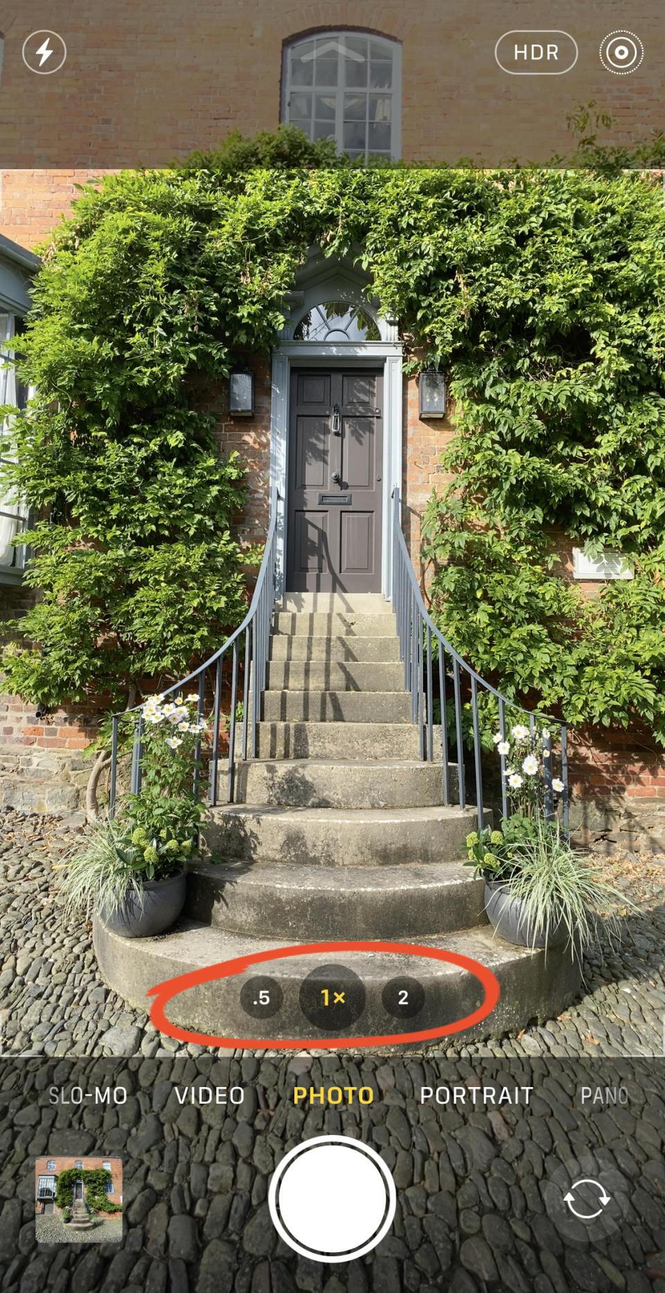 شما از نمادهای بزرگنمایی (0.5x، 1x و 2x) در پایین منظره یاب استفاده میکنید. 0.5x لنز Ultra Wide است. 1x لنز Wide است و 2x لنز تله فوتو است. توجه داشته باشید که فقط نمادهای لنزهایی را که در iPhone دارید، مشاهده خواهید کرد. برای استفاده از لنز Wide، اطمینان حاصل کنید که 1x انتخاب شده است. این لنز دارای زاویه دید متوسط گسترده است. برای جابجایی به لنز Ultra Wide، روی 0.5x ضربه بزنید.