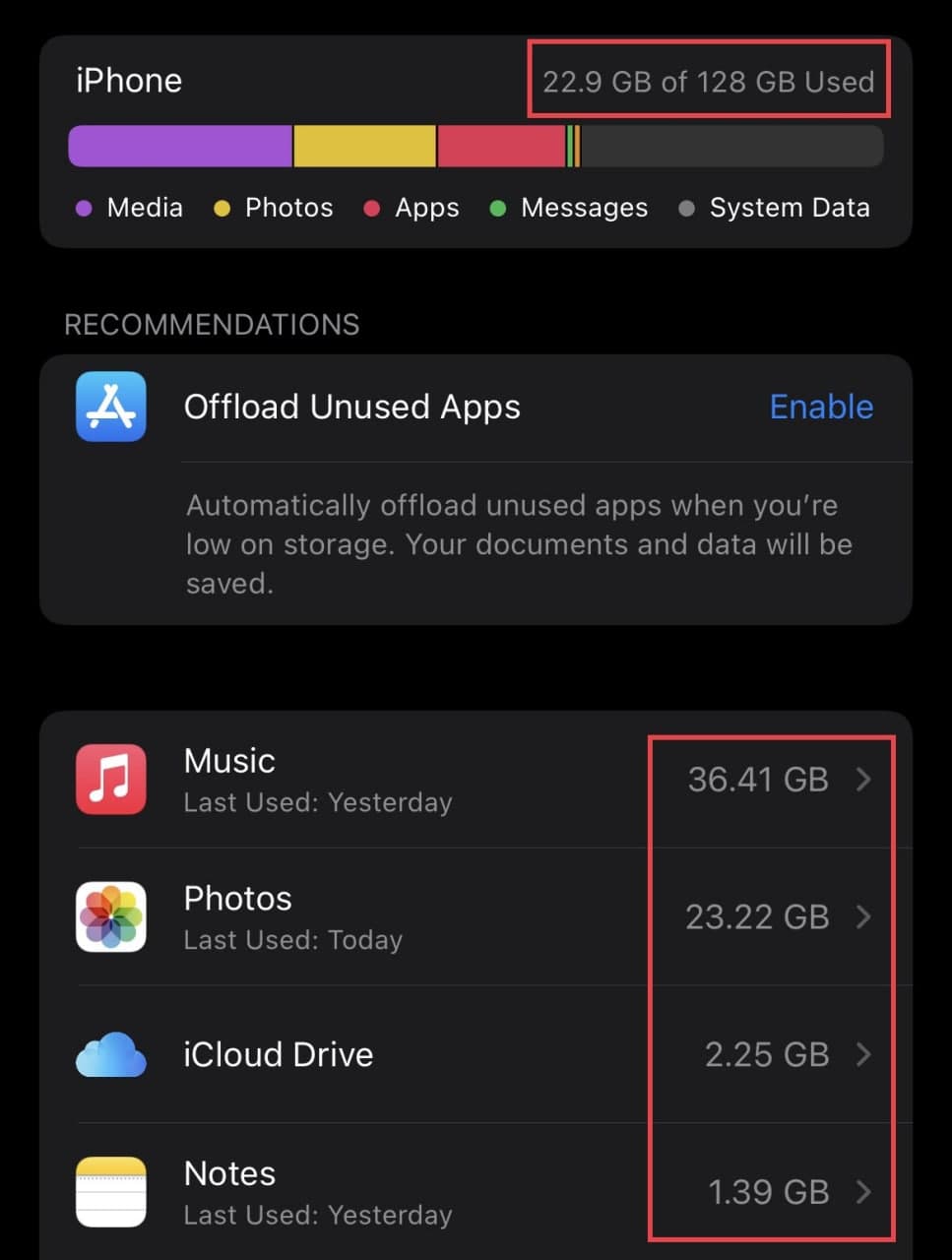 علاوه بر این، MacRumors در گزارش خود توضیح میدهد، برخی از کاربران اپل همچنین ادعا میکنند که پس از دریافت بروزرسانی iOS 15 دستگاههای آنها فضای داخلی بیشتری نسبت به ظرفیت واقعی آن نشان میدهد. برخی کاربران دیگر نیز ادعا میکنند که دستگاههای آنها در محاسبه میزان فضای اشغال شده توسط اپلیکیشنها و فایلها مانند تصویر بالا مشکلاتی دارد.