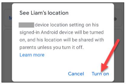 در یک پیام پاپ آپ توضیح داده می شود که موقعیت مکانی دستگاه فرزند شما روشن است و تا زمانی که آن را خاموش نکنید، موقعیت مکانی وی با شما به اشتراک گذاشته می شود. برای ادامه روی «Turn On» ضربه بزنید.