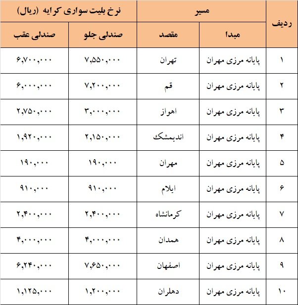 کرایه سواریهای بینشهری از مرز مهران تا ۱۰ مقصد مختلف به شرح ذیل است: