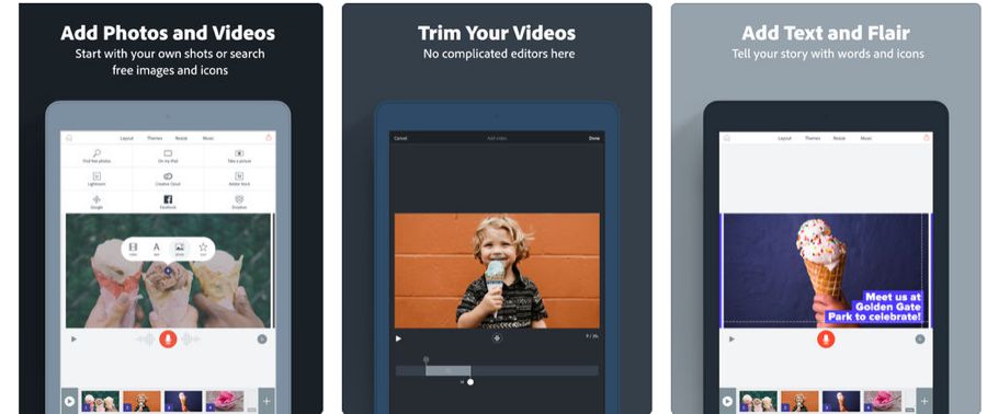 ادوبی یکی از نام‌های پیشرو در زمینه‌ طراحی و ارائه نرم‌افزارهای ویرایش تصویر و ویدیو برای سیستم‌ عامل‌های دسکتاپ محسوب می‌شود. این شرکت نیم نگاهی به پلتفرم‌ گوشی‌های هوشمند نیز داشته و اپلیکیشن‌های Adobe Spark را برای تصاویر و ویدیوهای خلاقانه منتشر کرده است. امکانات زیادی از جمله افکت‌ها، جلوه‌های صوتی، فونت‌های مختلف و انیمیشن‌ها در خانواده اپ‌های اسپارک وجود دارند.