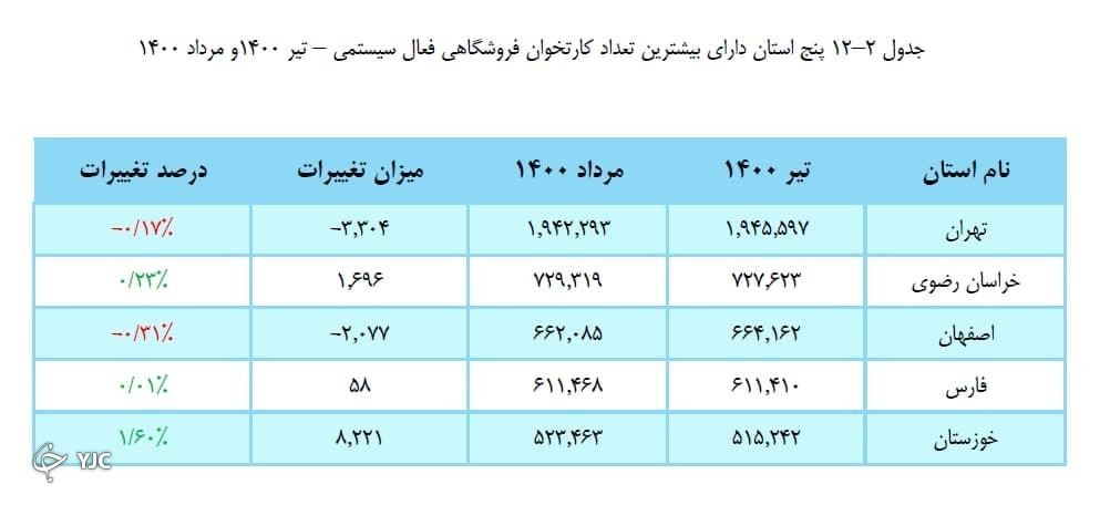 بر اساس جدول بالا، استان های تهران، خراسان رضوی،اصفهان، فارس و خوزستان به ترتیب بیشتری تعداد کارتخوان فروشگاهی فعال در مرداد 1400 بوده اند.
