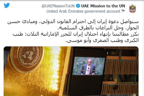 بر اساس گزارش «روسیا الیوم»، وی مدعی شد: همچنان از ایران می‌خواهیم به قانون بین‌الملل و اصول حسن همجواری احترام بگذارد و نزاع‌ها را از طریق مسالمت‌آمیز حل کند. همچنین مطالبه خود مبنی بر لزوم پایان اشغال جزایر سه‌گانه اماراتی "تنب بزرگ، تنب کوچک و ابوموسی" توسط ایران را تکرار می‌کنیم.