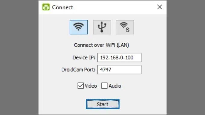- شما باید این پنجره گفتگو را در کلاینت رایانه مشاهده کنید. اگر این گونه نیست، آدرس DroidCam > Start انتخاب کنید.