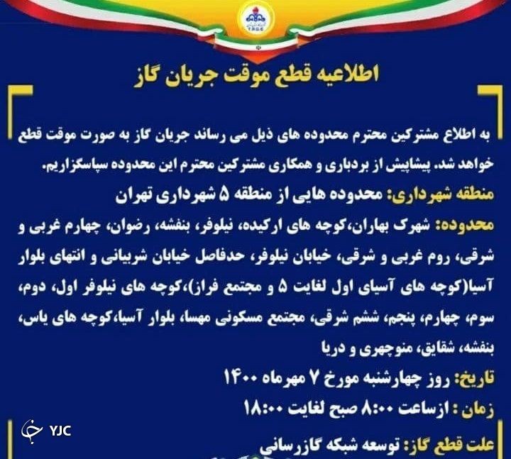 گاز محدودههایی از منطقه ۵ شهرداری تهران فردا به مدت ۱۰ ساعت قطع می شود