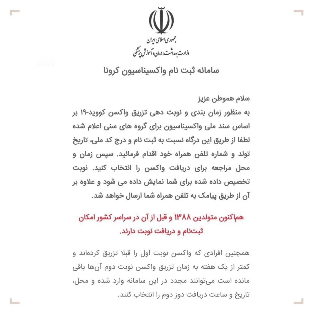 در اطلاعیه مرکز مدیریت آمار و فناوری اطلاعات وزارت بهداشت آمده است: همچنین افرادی که واکسن نوبت اول را قبلا تزریق کردهاند و کمتر از یک هفته به زمان تزریق واکسن نوبت دوم آنها باقی مانده است میتوانند مجدد در این سامانه وارد شده و محل، تاریخ و ساعت دریافت دوز دوم را انتخاب کنند.