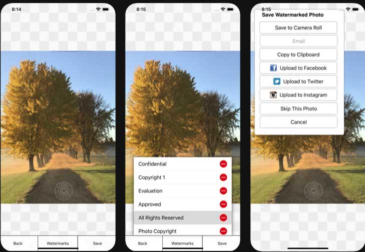 اپلیکیشن iWatermark به صورت اختصاصی برای افزودن یا حذف واترمارک به فایلها توسعه یافته است و برای هر دو سیستم عامل اندروید و iOS در دسترس قرار دارد. امکان ویرایش گروهی فایلها نیز در این اپ وجود دارد و برخی دیگر از ابزارهای پایه ویرایش مانند کراپ، چرخش و تغییر اندازه هم برای کاربران ارائه شده است. یکی از امکانات منحصر به فرد برنامه، قابلیت ویرایش متادیتای فایلها است.
