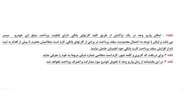 لازم به ذکر است که باتوجه به اینکه قرعهکشی برای این طرح وجود ندارد، متقاضیان در زمان ثبتنام، وجه خودرو را واریز کنند. برای ثبتام و واریز وجه، مشتری با وارد نمودن کد کابری و کلمه عبور خود، به صفحه ثبتنام خود وارد و پس از انتخاب رنگ خودرو، نسبت به واریز وجه صرفا به صورت اینترنتی در زمان ثبتنام اقدام کنند.