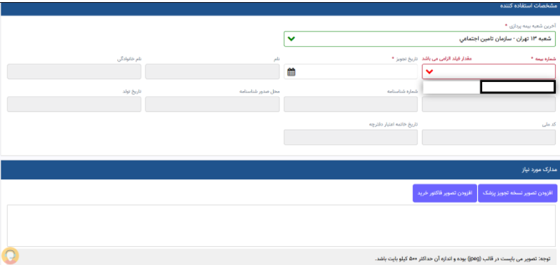 در قسمت شماره بیمه، شماره بیمه فردی که پروتز توسط پزشک معالج جهت وی تجویز شده و فاکتور خرید به نام وی است انتخاب شود.