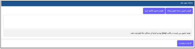 در قسمت مدارک مورد نیاز، نسخه پزشک و فاکتور خرید را بارگذاری کرده و با انتخاب کلید ثبت در خواست ، در خواست را ثبت کنید.