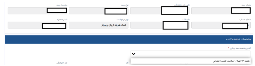 با ورود به منوی خدمت مذکور، اطلاعات هویتی فرد و شماره حساب ثبت شده نمایش داده می شود و متقاضی باید شعبه مربوطه را انتخاب کند ، چنانچه بیمه شده در بیش از یک شعبه بیمه پرداز بوده، نزدیکترین شعبه را انتخاب کند.