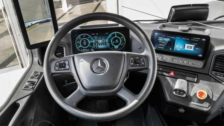 امکانات مدرن این کامیون الکتریکی مرسدس بنز شامل نمایشگر دیجیتال راننده و نمایشگر لمسی سیستم اطلاعات و سرگرمی است که برای دسترسی بهتر، کمی به سمت راننده زاویه دارد. یک نمایشگر بزرگ دیگر هم بهصورت عمودی روی قاب درها نصب شده است که تصاویر دوربین عقب کامیون را بهصورت زنده نشان میدهد. در جلوی راننده هم پنجرهی گستردهی ایآکتروس منظرهای بینظیر از مسیر را ارائه میدهد.