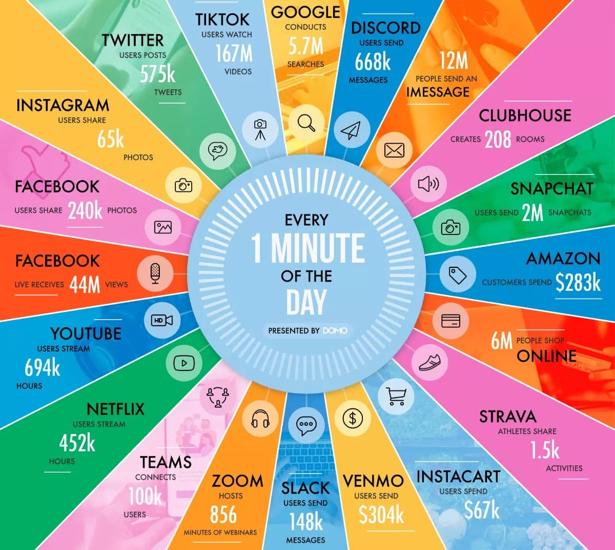 اینفوگرافیک جدیدی از سوی شرکت نرمافزاری «Domo» منتشر شده که به این سوال به صورت کلی پاسخ میدهد. در این اینفوگرافیک، اطلاعات جالبی از فعالیت کاربران اینترنت در سطح جهان در بازه زمانی یک دقیقه ارائه شده است. برای مثال طبق یافتههای این شرکت، در هر ۶۰ ثانیه ۵.۷ میلیون جستجو در گوگل انجام میشود. در همین مدت زمان کاربران فیسبوک و اینستاگرام به ترتیب ۲۴۰ و ۶۵ هزار عکس را با سایر کاربران به اشتراک میگذارند.