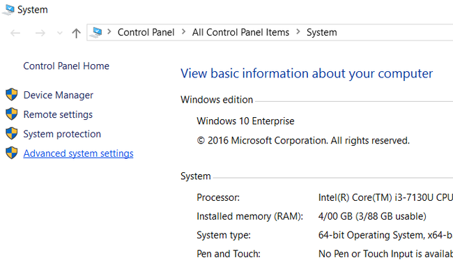 ابتدا با استفاده از This PC (در ویندوزهای قدیمیتر بخش My Computer) یا منوی استارت به Control Panel بروید و سپس بر روی گزینه System And Security کلیک کنید. حال نوبت به انتخاب گزینه Advance System Settings در سمت چپ پنجره باز شده میرسد.