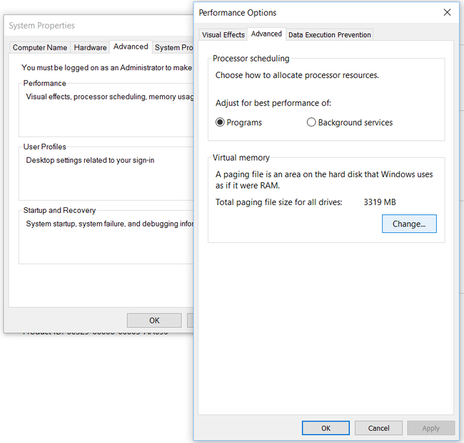 حال یک پنجره به نام System Properties برای شما به نمایش گذاشته میشود. اکنون تب Advanced را انتخاب نموده و در ادامه در بخش Performance، با کلیک روی دکمه Setting و انتخاب دوباره تب Advanced در پنجره جدید، به حافظه مجازی کامپیوتر خود در بخش Virtual Memory دسترسی پیدا کنید.