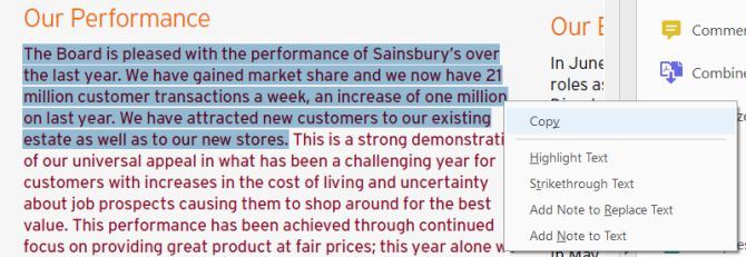 برای شروع کار، فایل پی دی اف را باز کرده و روی آن کلیک چپ کنید و نشانگر ماوس را تا جای مدنظرتان بکشید تا متن هایلایت شود. حالا با راست کلیک روی ناحیه منتخب، گزینه Copy را انتخاب کنید.