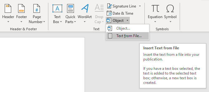 فایل ورد را باز کرده و روی گزینه Insert روی نوار بالایی کلیک کنید. در بخش Text، روی فلش رو به پایین کنار گزینه Object کلیک کرده و سپس گزینه ...Text from File را انتخاب کنید.