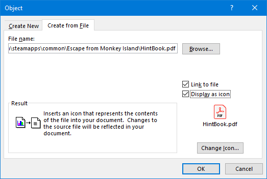در اینجا میتوانید تنها روی گزینه OK کلیک کنید تا یک تصویر ثابت از صفحه اول PDF را درون سند ورد قرار دهد. اگر دوبار روی این تصویر کلیک کنید، فایل PDF باز میشود. بجای اینکار میتوانید گزینه Link to file را انتخاب کنید که اگرچه همچنان اولین تصویر فایل پیدیاف را درون ورد قرار میدهد، اما اگر هر تغییری در پیدیاف ایجاد شود، بطور خودکار در ورد هم اعمال خواهد شد.