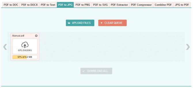 درون سایت، روی گزینه Upload Files کلیک کنید و پس از پیدا کردن فایل PDF روی سیستمتان، روی گزینه OK کلیک کنید. تا پایان آپلود و تبدیل فایل صبر کرده و در نهایت گزینه Download All را انتخاب کنید.