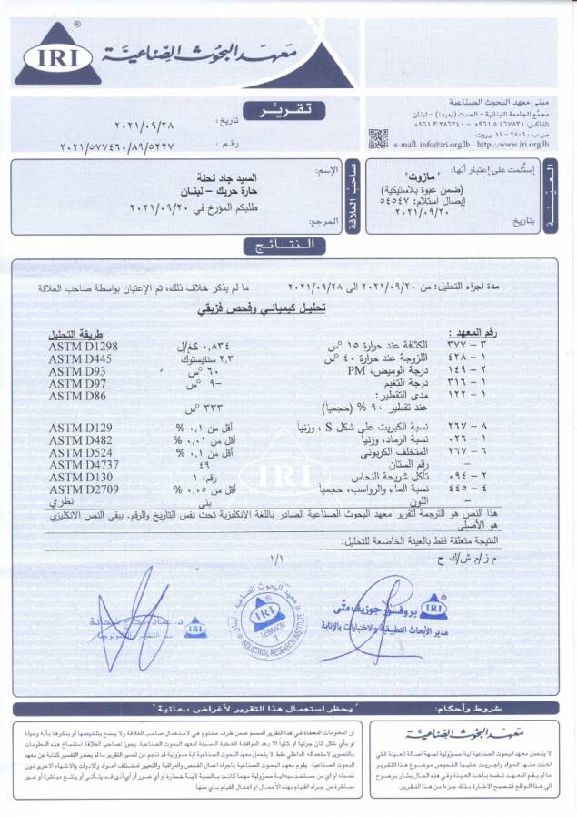 الدیار در ادامه نوشت که پس از آزمایش، مشخص شده است که مازوت ارسالی از ایران مطابق با استنانداردها و شروط تعیین‌شده از جانب سازمان استاندارد لبنان است و در نتیجه این سوخت برای استفاده در ژنراتورهای تولید برق و تمام خودروهای دیزلی مناسب است
