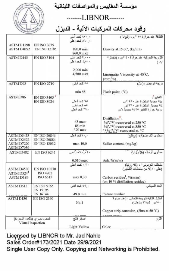 طبق این گزارش، از مؤسسه مذکور درخواست شده تا مطابق شروط تعیین‌شده از جانب سازمان استاندارد لبنان (Libnor)‌، بررسی شود که آیا سوخت ارسالی از ایران قابل استفاده در خودروهای دیزیلی هست یا خیر.