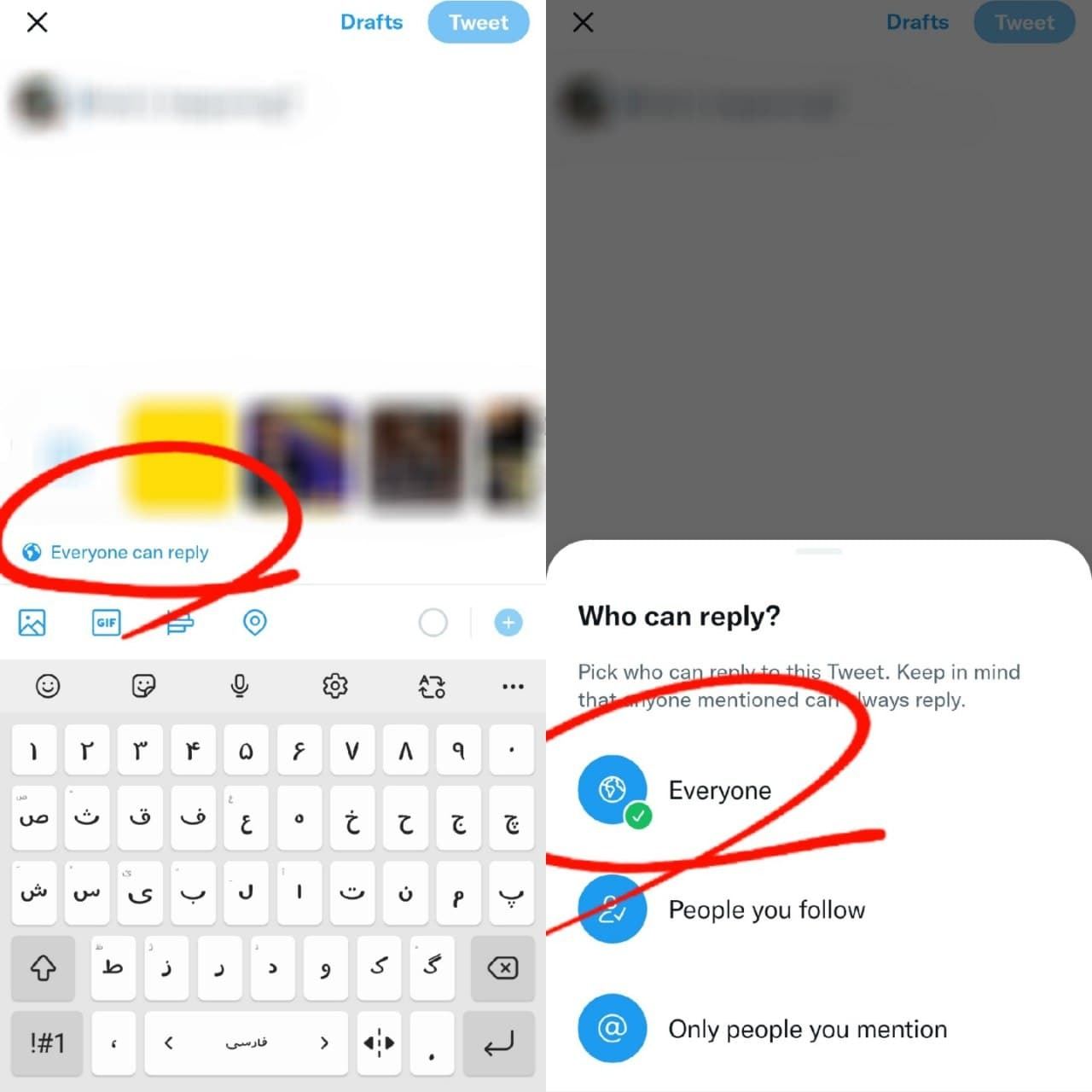 مرحله ۱: هنگامی که میخواهید توئیتی را منتشر کنید، در پایین گزینهای را مشاهده میکنید که میگوید "همه میتوانند پاسخ دهند". کافی است روی آن ضربه بزنید. این گزینه به توئیتر کمک میکند تا بداند چه کسی میتواند به توئیت شما پاسخ دهد.