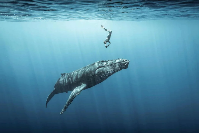 نهنگ کوهان داریک نفر غواصی می کند تا عکسی از یک نهنگ کوهان دار بگیرد. حیوانات هم اندازه اتوبوس مدرسه به خاطر آهنگ های ملودیک و تناقض چشمگیرشان معروف هستند. Sébastien Pontoizeau