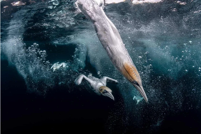 گانتسگانتس در جزایر شتلند، جزیره نوس، بریتانیا برای ماهی خال خالی غواصی میکند. هنلی اسپایرز