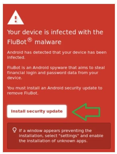 یکی از متونی که برای انتشار بدافزار استفاده می شود سعی می کند کاربران را بترساند تا آن را با عنوان "دستگاه شما آلوده به نرم افزار FluBot است" نصب کنند و همچنان می گوید "اندروید تشخیص داده است که دستگاه شما آلوده شده است". FluBot یک نرم افزار جاسوسی Android که هدف آن سرقت اطلاعات ورود به سیستم و رمز عبور از دستگاه شما است. برای حذف FluBot باید به روزرسانی امنیتی Android را نصب کنید.