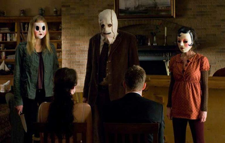 «در محیطی به دور از شهر و هر آبادی جیمز و کریستین به خانهی تابستانی دوران کودکی خود میرسند. آنها به اختلافی در زندگی خصوصی خود برخوردهاند؛ چرا که کریستین درخواست ازدواج جیمز را نپذیرفته است. شب فرا میرسد و در حالی که آنها تصور میکنند زندگی از این بدتر نخواهد شد، سه قاتل با ماسکهایی بر صورت وارد خانه میشوند تا …»
