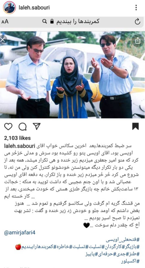 لاله صبوری بازیگر سینما و تلویزیون، در صفحه خود در فضای مجازی، پستی درباره همکاریاش با فتحعلی اویسی در سریال «کمربندها را ببندیم» منتشر کرد.