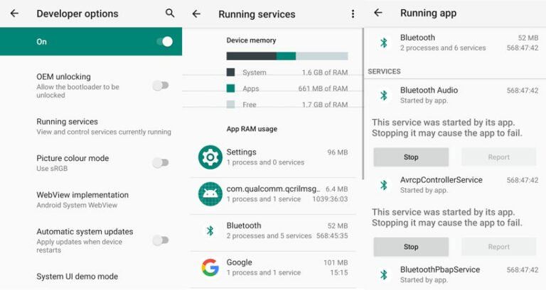 پس از ورود به منوی Developer options، گزینهی Running services یا Processes را انتخاب کنید تا برنامهها و پردازشهای در حال اجرا در پسزمینه را مشاهده کنید.