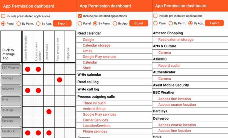 با استفاده از این اپ، شما میتوانید اطلاعات را در قالب دسترسیها یا اپها فهرستبندی کنید. همچنین، میتوانید اپهای از پیش نصب شده را هم به فهرست اضافه کنید. دادههای جمعآوری شده از طریق App Permission Dashboard بهصورت صفحه گسترده هم قابل دسترس هستند تا کاربران بتوانند سابقهای از مجوز دسترسی اپهای خود در اختیار داشته باشند.