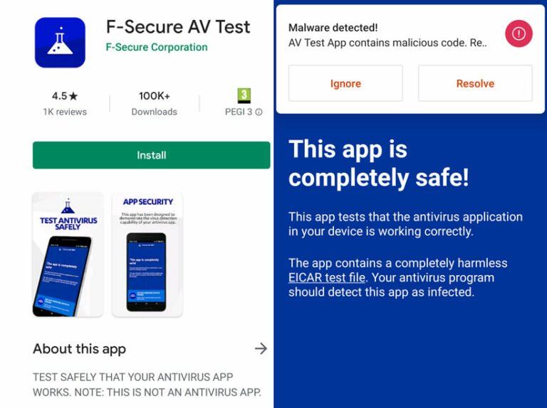 برای آزمایش کارایی سرویسهای محافظ گوشی خود میتوانید از یک ابزار رایگان بهنام F-Secure AV Test استفاده کنید. این ابزار با استفاده از فایل تست ضد بدافزار توسعه داده شده توسط EICAR (انیستیتو اروپایی تحقیقات آنتی ویروس رایانه) به بررسی چگونگی کار کردن اپهای امنیتی روی گوشی شما میپردازد.