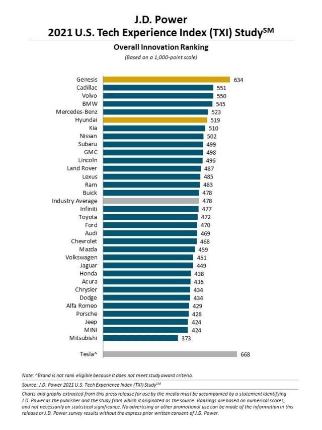 مطالعهی شاخص تجربهی فناوری (TXI) از سوی J.D. Power جنسیس را با ۶۳۴ امتیاز بهعنوان بالاترین رتبهی کلی در میان خودروسازان و همچنین برترین خودروساز لوکس معرفی میکند. این برند کرهی جنوبی ۶۳۴ امتیاز دارد و در بخش ممتاز، کادیلاک با ۵۵۱ امتیاز، ولوو با ۵۵۰ امتیاز، بیامو با ۵۴۵ امتیاز و مرسدس بنز با ۵۲۳ امتیاز در ردههای بعدی قرار دارند.