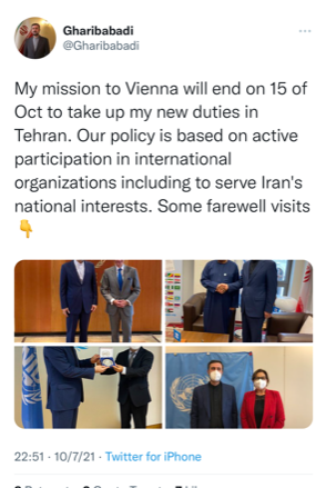 سفیر و نماینده دائم ایران در سازمان های بین المللی در وین از پایان ماموریتش خبر داد و نوشت: ماموریت من در وین از ١۵ اکتبر (٢٣ مهر) به منظور تصدی مسئولیت جدید در تهران، پایان می یابد.